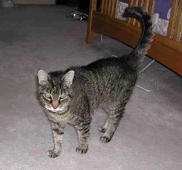 I talked to her all the time. She would pay close attention but always had this uncomprehending look on her face of course. But I eventually figured out she would answer to "Hey you!" since that's how I always called for her attention. She would also answer to a whistle I'd give when I fed her, a trick Sheryl showed me for getting the cat's attention. We were good buddies; watch TV together; she'd sleep on a corner of my bed (and sit up with me when I was sick or couldn't sleep); play "chase the wiffle golf ball" and various other games. In Millbury I had a bay window and she loved to sit in it and survey the neighborhood.